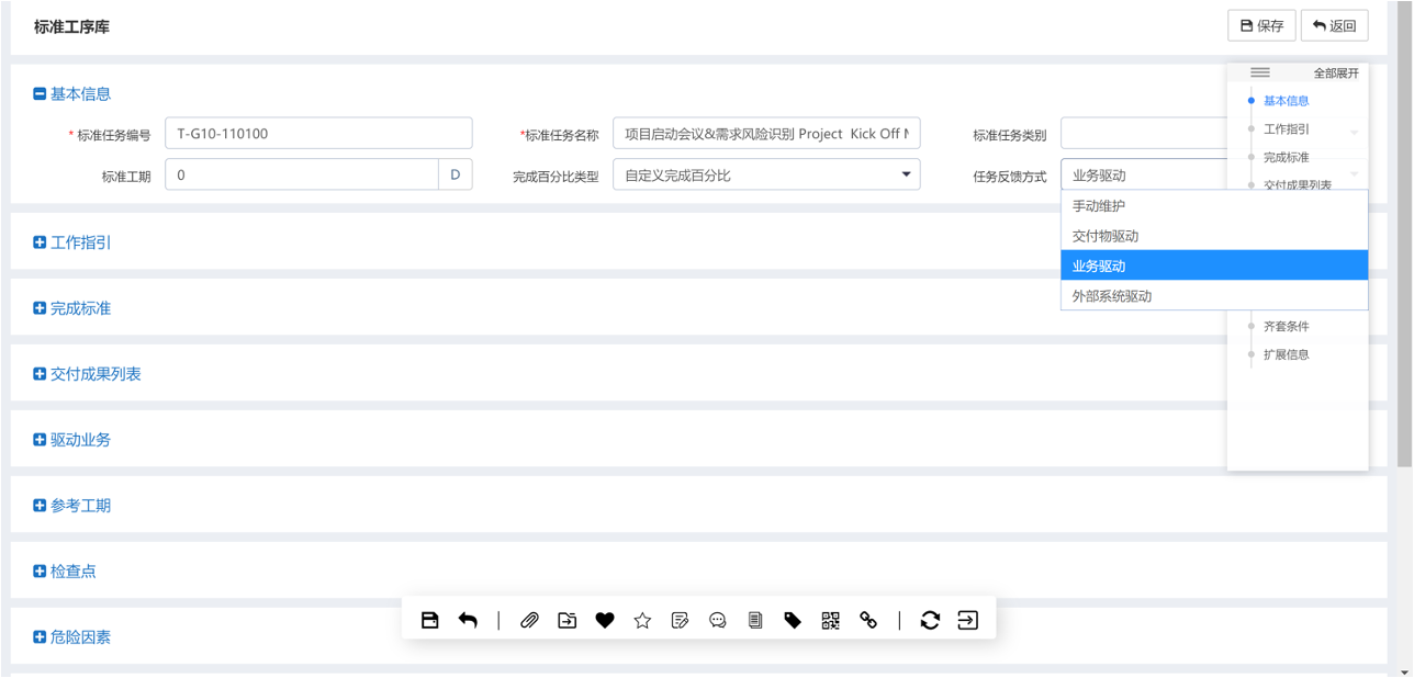 計劃模板中的標準任務(wù),涵蓋任務(wù)描述、標準工期、邏輯關(guān)系、工作指引、完成標準、交付物成果、驗收條件、所需資源、經(jīng)驗教訓等內容。
