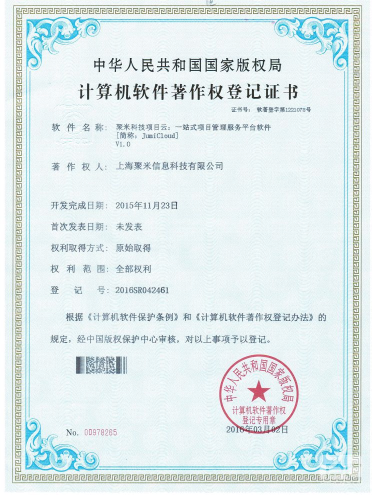近日,聚米科技喜獲由中華人民共和國國家版權局頒發(fā)的計算機軟件著(zhù)作權證書(shū):《聚米科技項目云:一站式項目管理服務(wù)平臺軟件[簡(jiǎn)稱(chēng):JumiClo
