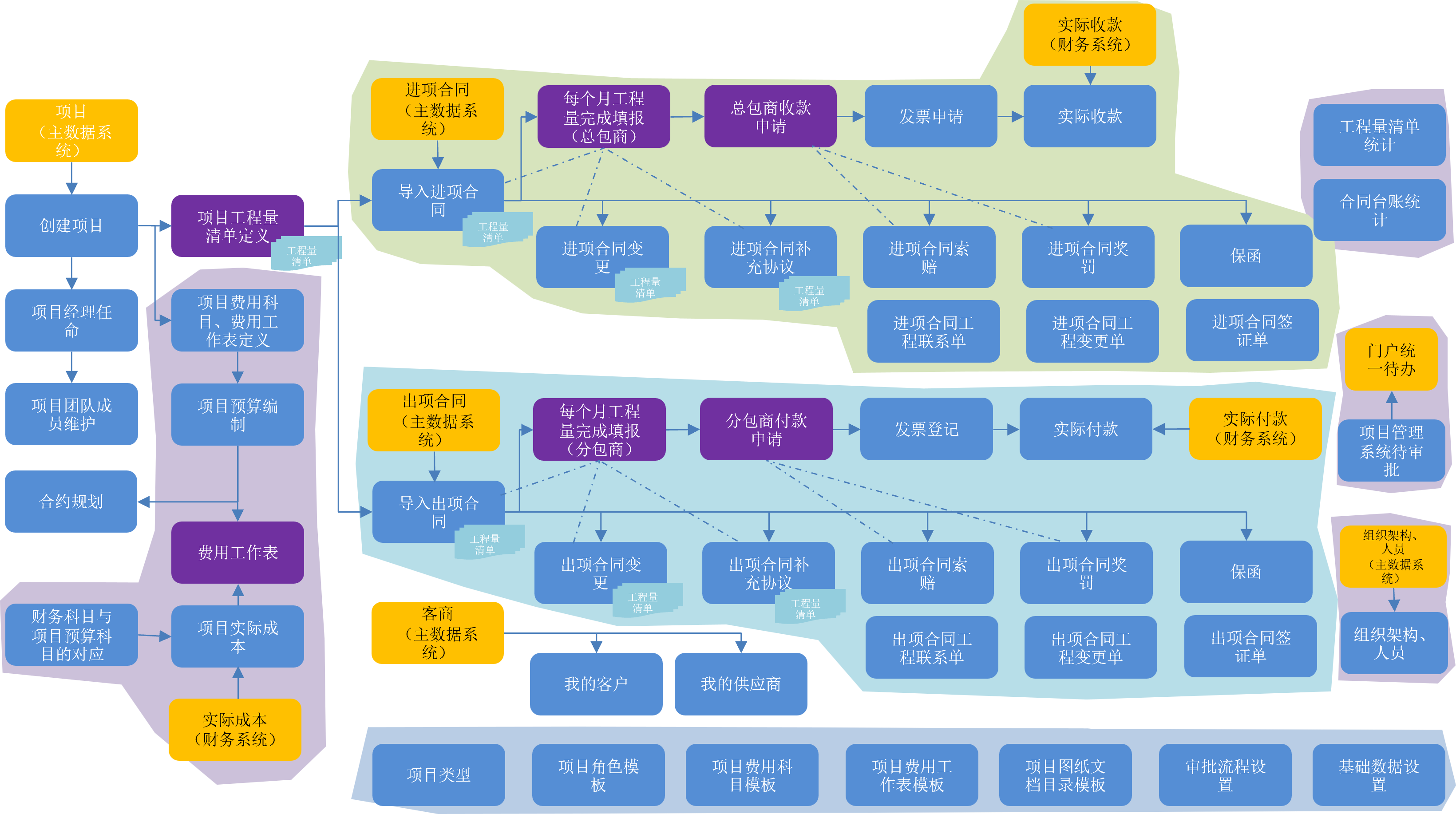 第一批上線(xiàn)的功能主要包括組織架構、項目類(lèi)型、數據模板、項目、項目人員、總包合同、分包合同、工程量清單、月度工程量完成情況填報、收款申請、發(fā)票申請、實(shí)際收款、付款申請、發(fā)票登記、實(shí)際付款。完成了與主數據系統、合同管理系統、財務(wù)系統、門(mén)戶(hù)系統的4個(gè)系統11個(gè)接口的開(kāi)發(fā)與集成工作。完成了8類(lèi)典型項目的數據模板、業(yè)務(wù)流程、審批流程的梳理。應用范圍涵蓋院、10余個(gè)二級分院及在建的幾十個(gè)項目。
