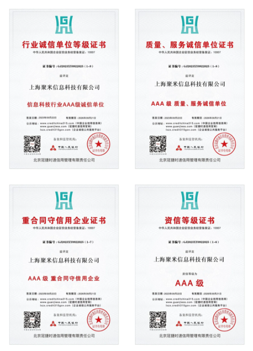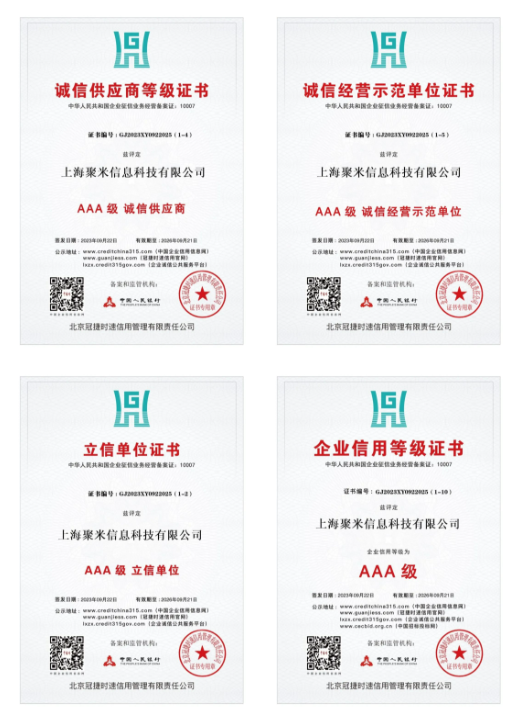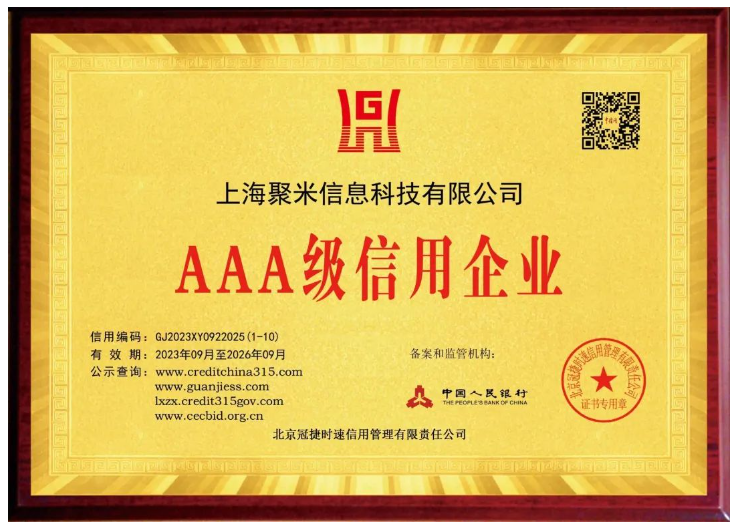 這代表了企業(yè)信用評價(jià)的最高級別,未來(lái)聚米將始終堅持,誠信立企,守信經(jīng)營(yíng)。